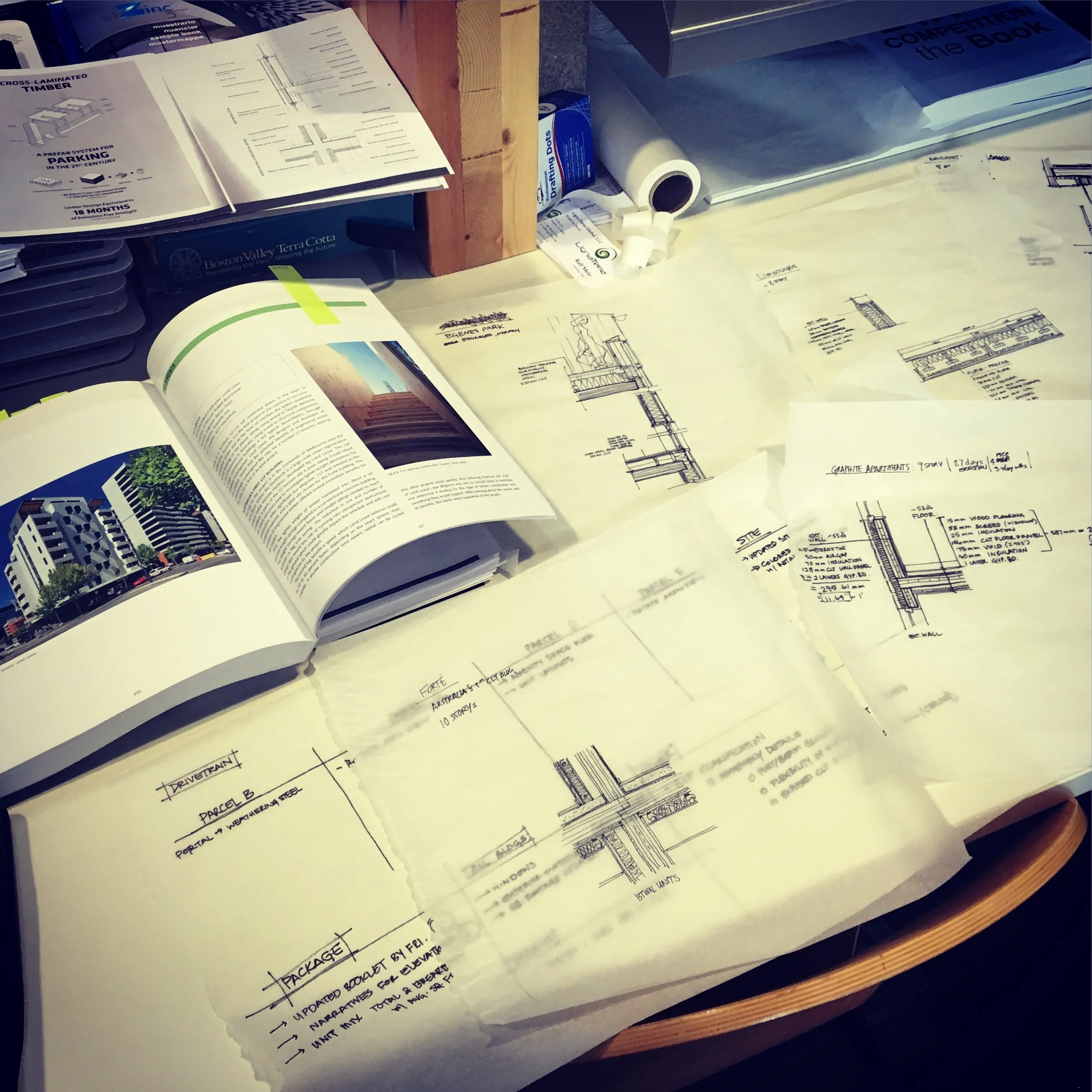 Precedent studies have been a major influence towards understanding the details and systems integration with CLT. Partnerships with manufacturers around the globe, structural engineers, City planners & code reviewers will all be key in brining this material to the United States on a larger scale.